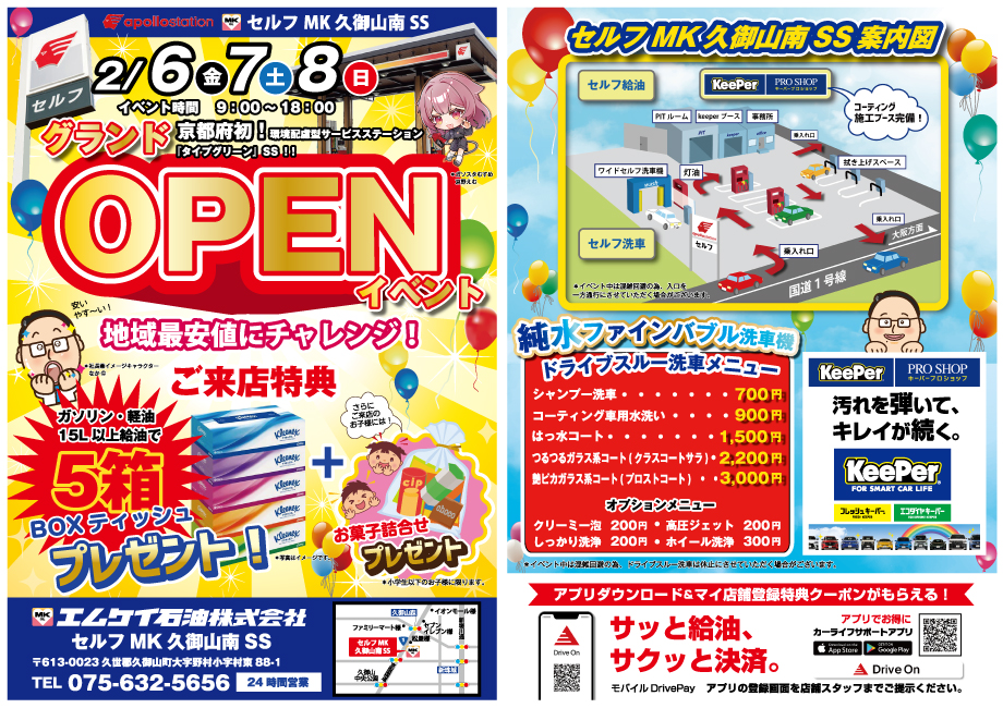 久御山南SSがセルフMK久御山南SSとしてリニューアルオープンいたします。2月6日(金)グランドオープン!
